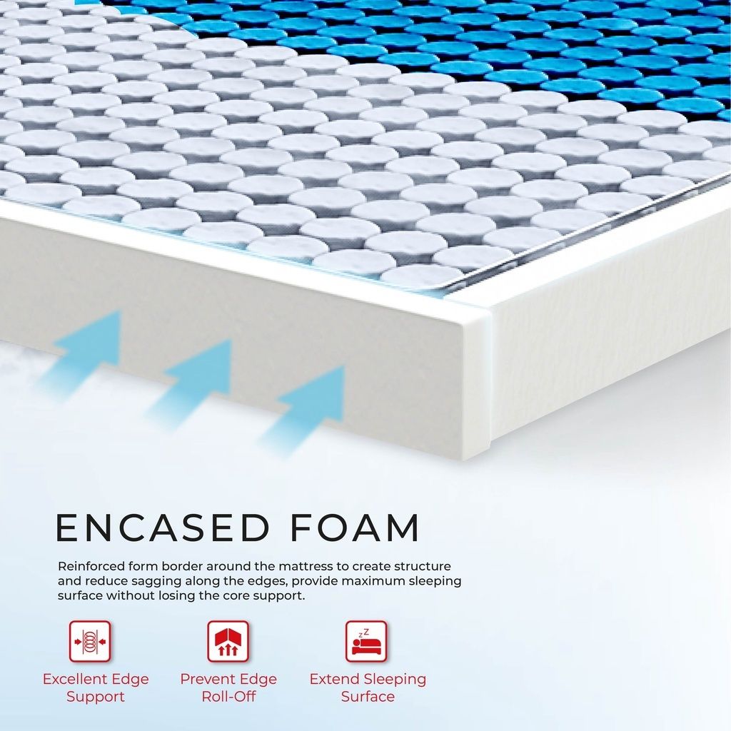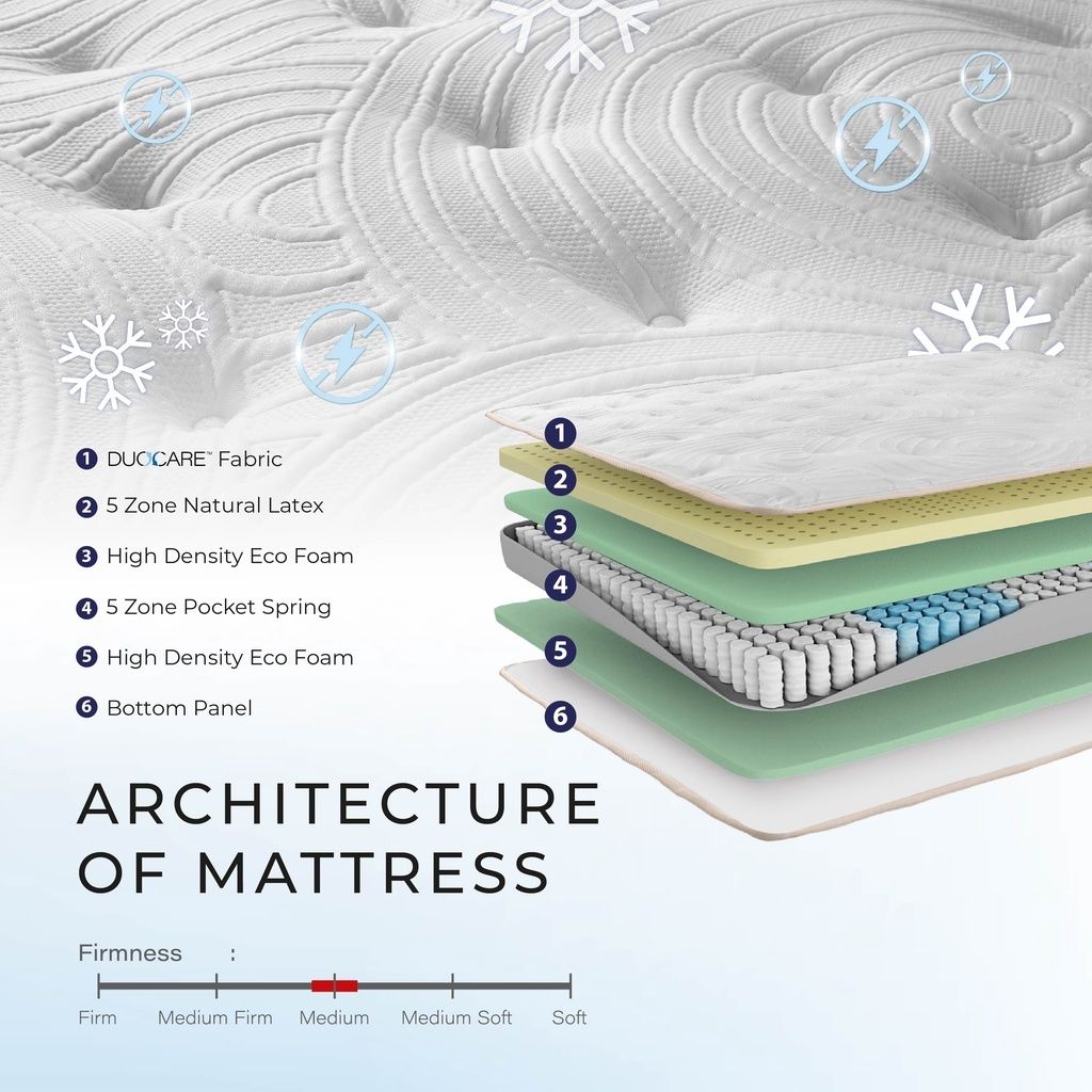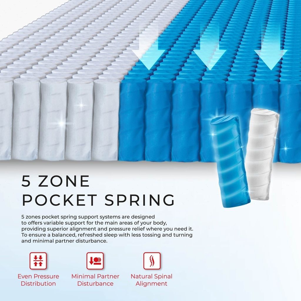 Spring system: Pocket Spring with 5 zones support with encased foam + natural latex topper